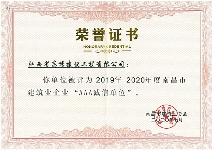 近日,經(jīng)南昌市建筑業(yè)協(xié)會(huì)的評(píng)審,高能建工獲得2019—2020年南昌市建筑業(yè)企業(yè)“AAA誠(chéng)信企業(yè)”榮譽(yù)稱號(hào)。