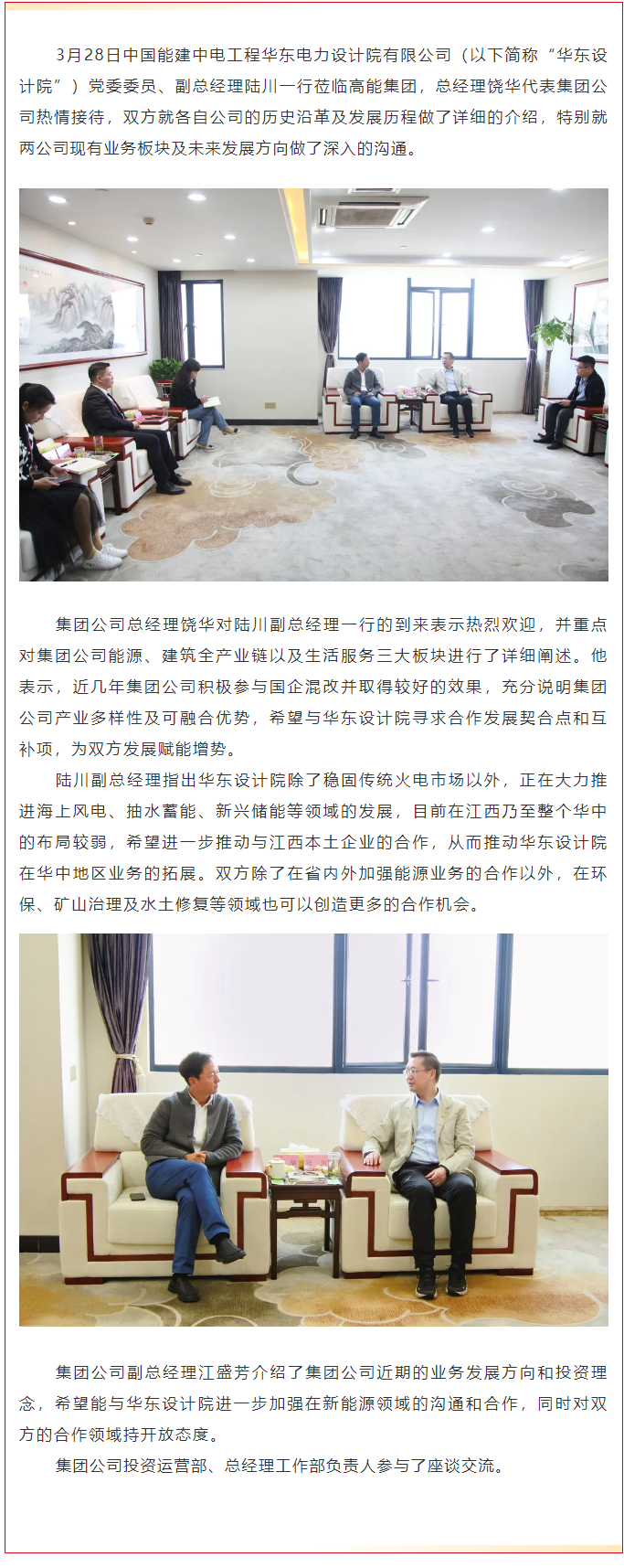 中國能建中電工程華東電力設(shè)計院有限公司黨委委員、副總經(jīng)理陸川一行蒞臨高能集團(tuán)座談交流