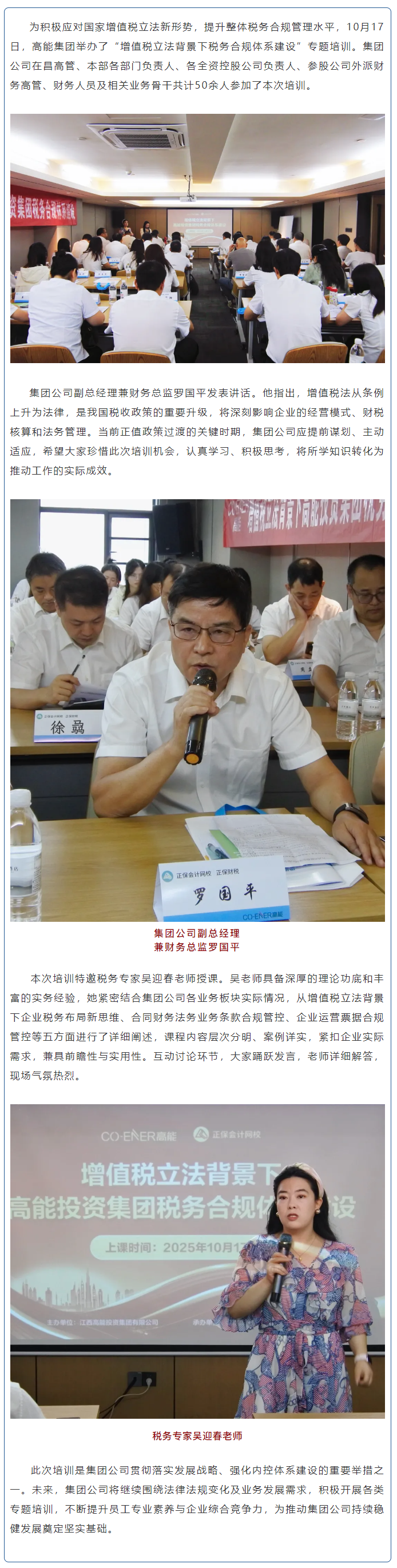 高能集團舉辦“增值稅立法背景下稅務合規(guī)體系建設”專題培訓